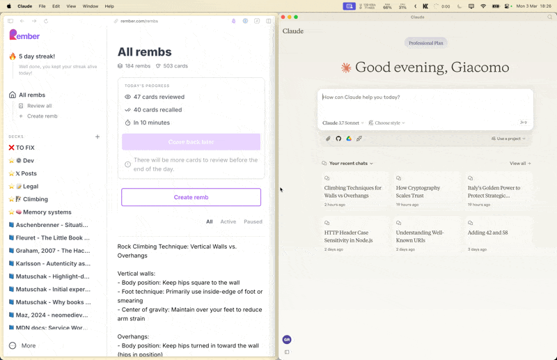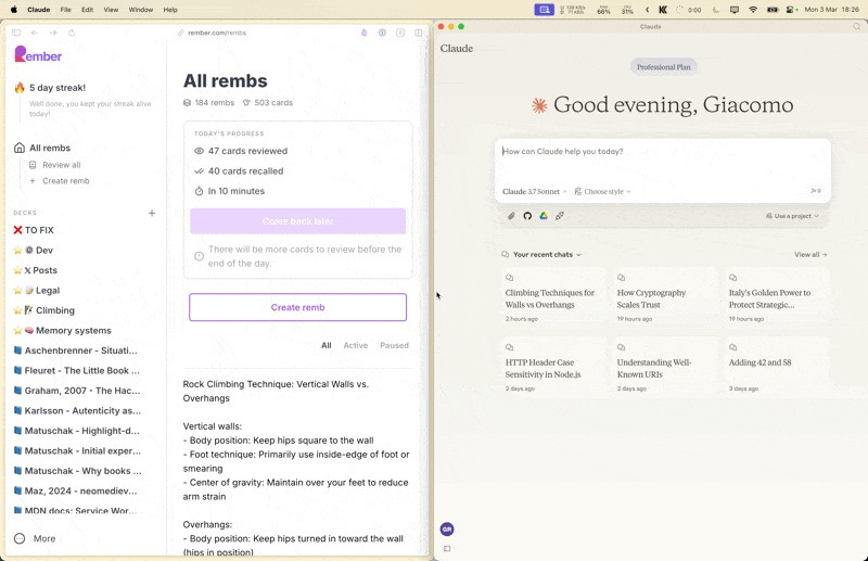 Say "help me remember this" and Claude will create spaced repetition flashcards in Rember.com